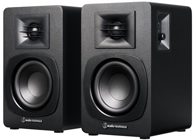 Perfect for use with turntables. computers. smartphones or other devices. the AT-SP3X powered bookshelf speakers deliver rich. full-range audio via a wired or wireless connection. These compact. unobtrusive speakers elevate the listening experience in any room. They feature 3' woofers and 1.1' tweeters specially tuned by a built-in DSP to produce powerful. well-balanced sound for music. movies. and more.