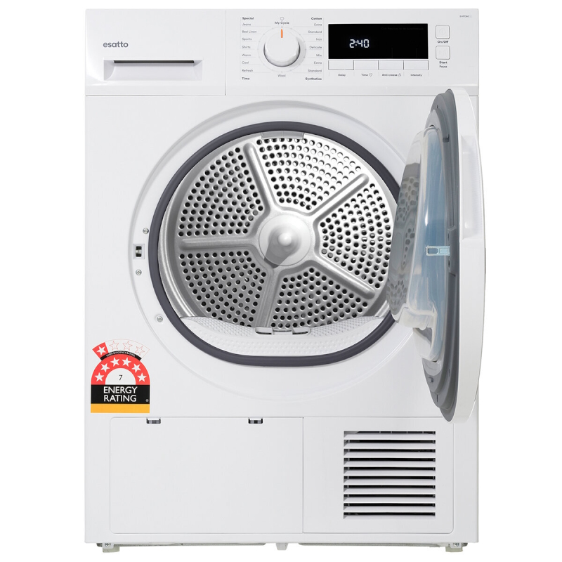 Discover the perfect blend of efficiency and performance with the Esatto 8kg Heat Pump Dryer EHPD80. Designed to offer superior energy savings, this dryer features innovative heat pump technology that significantly reduces power consumption while ensuring gentle care for your clothes. Ideal for families and larger households, the 8kg capacity accommodates more in a single load. Equipped with smart drying options, the EHPD80 adjusts the cycle duration to the moisture levels, preventing over-drying and fabric damage. Its modern design and user-friendly controls make it a great addition to any home. Enhance your laundry experience with the Esatto Heat Pump Dryer today!