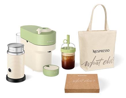 Enjoy a bonus iced coffee tumbler and tote bag. plus 12 free capsules