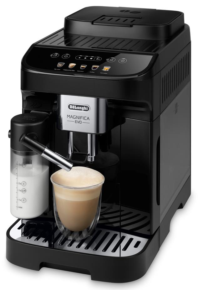 The Magnifica Evo embodies De'Longhi innovation and advanced technology. with authentic beverages and sleek black design. Freshly grind your favourite beans and serve perfect Italian espressos and a range of other coffee and milk beverages. with 5 one-touch recipes available through the intuitive colour display. Enjoy the silky smooth texture of dense and creamy milk froth thanks to the exclusive LatteCrema System. It's ideal for both new and experienced 'at-home' coffee makers.